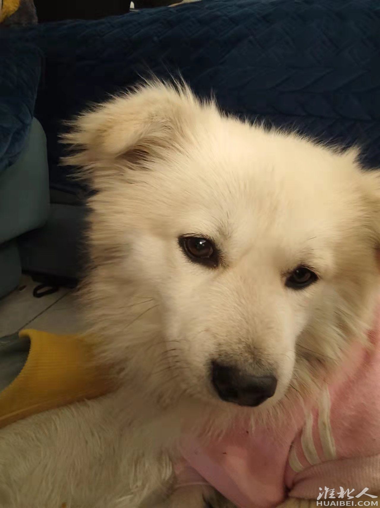 白黄色混种公狗,脖子上挂有铃铛,尾巴很卷,丢失时未穿衣服,自行在家剃毛,身上有明显的剃毛痕迹,3岁