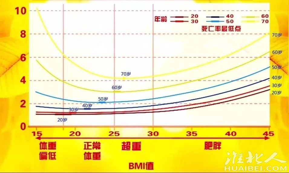 关于体重的BMI指数,BMI=体重(kg)身高(m)。正常的BMI指数在18.5到23.9属于正常范围。如果一个人体重45㎏,身高1.72m。那么他的BMI=451.72=15。这就属于体重过轻。如果一个人100㎏,身高1.75米。BMI=1001.75=33,这就属于超重。如图中所示。体重bmi 指数在15和45的死亡率最高,到了60岁和70岁之间死亡率大大提升。死亡率指数为8到10,相当于死亡风险增加了80%。所以太胖或者太瘦,寿命往往不会超过60岁,70岁也就更难了。