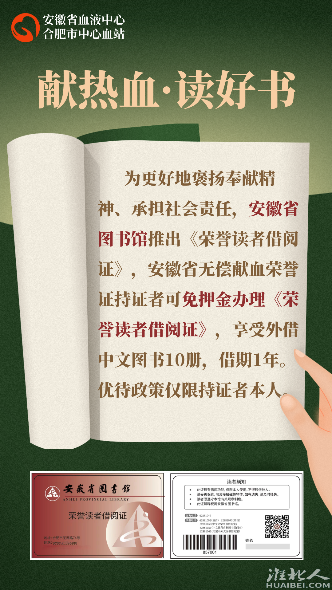 为更好地褒扬奉献精神、承担社会责任,安徽省图书馆推出《荣誉读者借阅证》,安徽省无偿献血荣誉证持证者可免押金办理《荣誉读者借阅证》,享受外借中文图书10册,借期1年。优待政策仅限持证者本人。